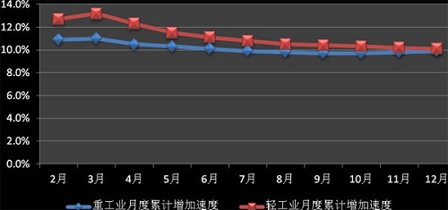 2012 Chinas heavy development is relatively stable, the monthly growth rate of total industrial added value up to 11% in March, the lowest was 9.7% in September. For a long time, Chinas heavy industry, light industry growth rate has been faster than the pace of development, but by the internal and external economic slowdown, domestic demand and other factors, in 2012 the development of heavy industry appeared inversion phenomenon. February 2012, Chinas heavy industry total industrial added value increased monthly rate of 12.7%, 10.9%, to 12 months, has developed into a 10.1%, 9.9%. Overall, although the growth rate of heavy industry behind light, but it gradually narrow the gap.